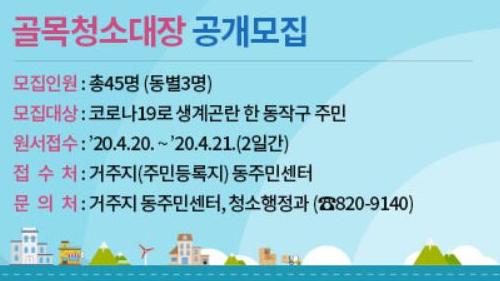 동작구(구청장 이창우)가 다음달부터 10월까지 6개월 간 코로나19 경제 위기로 생계가 어려운 주민들에게 일자리를 제공하기 위해 골목청소대장을 운영한다고 17일 밝혔다.
