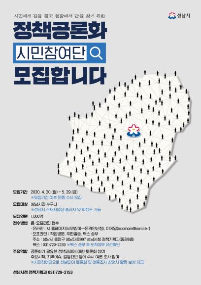 성남시는 오는 4월 20일부터 5월 29일까지 ‘정책 공론화 시민참여단’ 1000명을 모집한다.