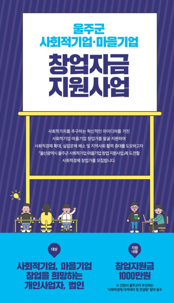 신청서류는 울주군청 홈페이지 열린군정, 일반공고란에서 확인 가능하며, 문의는 일자리정책과 사회적경제팀(052-204-1372)으로 하면 된다.