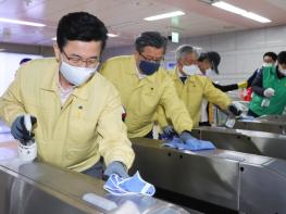 허태정 대전시장은 이 날 유성온천 인근에서 펼쳐진 환경 정화활동에 참여해 유성온천역 내부 소독과 충남대 입구로 이어지는 가로변 환경정비 활동을 함께했다.