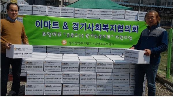 경기도사회복지협의회(회장 강기태)와 ㈜이마트(대표이사 강희석)는 지난 16일 코로나19로 인해 어려움을 겪고 있는 저소득계층을 지원하기 위한 ‘이마트 희망배달마차 코로나19 원기회복 KIT’400박스(1,200만원 상당)를 남양주푸드뱅크(시설장 강경완)에 전달했다.