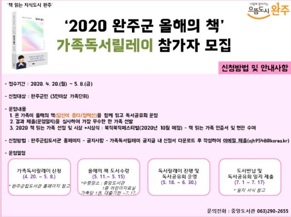 이외에도 완주군은 2020 올해의 책 선정 관련 연계행사로 하반기에는 작가 초청 북 콘서트 등을 추진해 군민과의 소통을 꾸준히 이어갈 계획이다.