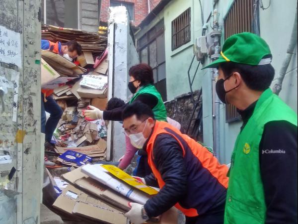 부산 남구 감만2동 행정복지센터(동장 김은정)는 지난 30일 감만2동 지역사회보장협의체(회장 윤영범), 새마을지도자협의회(회장 안성하)와 협력하여 관내 저장강박 세대에 방치된 5톤 가량의 쓰레기를 치우고 방역 소독을 실시했다.