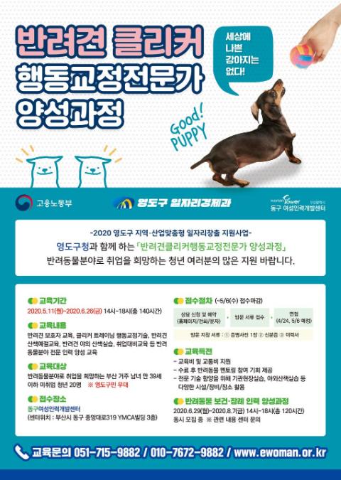 부산 영도구(구청장 김철훈)는 청년 구직자를 위한 일자리창출사업으로 ‘반려동물 클리커행동교정전문가 양성과정’ 훈련생 20명을 5월 6일까지 모집한다.