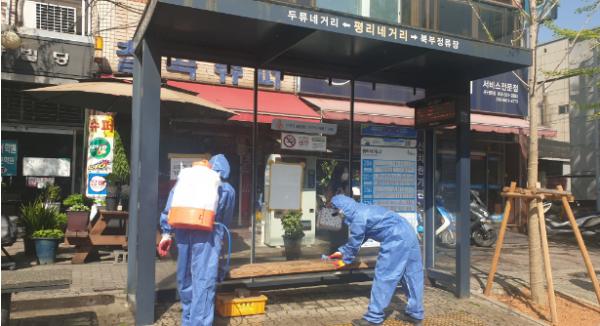4월 13일부터 5월 5일까지 매일(월~토) 오후 2시부터 관내 버스정류장 185개소 및 시장, 마트 주변에 소독약을 분무하고 사람들의 접촉면이 많은 의자, 손잡이 등의 시설물에 표면 소독도 함께 실시한다.