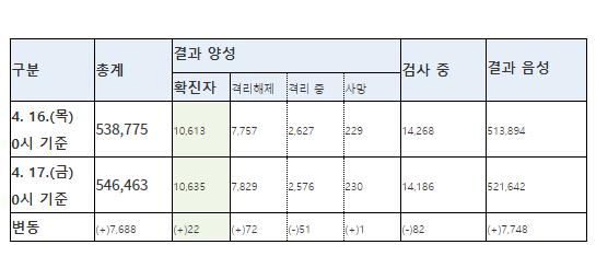 질병관리본부 중앙방역대책본부(본부장 정은경)는 4월 17일 0시 현재, 총 누적 확진자수는 10,635명(해외유입 983명(내국인 91.7%))이며, 이 중 7,829명(73.6%)이 격리해제 되었다고 밝혔다. 신규 확진자는 22명이고, 격리해제는 72명 증가하여 전체적으로 격리 중 환자는 감소하였다.
