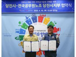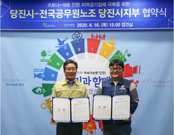 당진시와 전국공무원노동조합 당진시지부(이하 조합)가 16일 시청 접견실에서 코로나19 지역경제 위기 극복을 위한 협약을 체결했다.