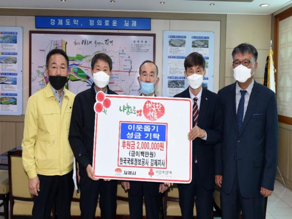 이번에 전달한 성금은 한국국토정보공사 김제지사 임직원들이 십시일반 자발적으로 모금하여 마련한 것이다.