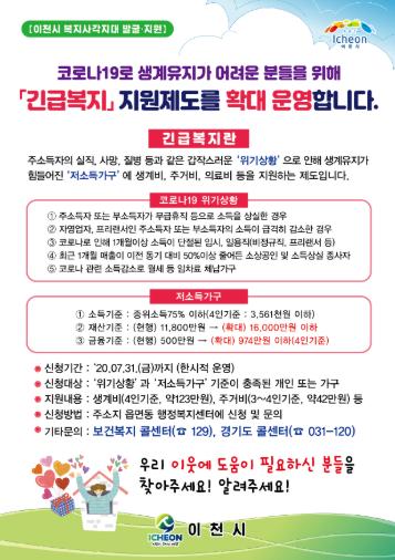 이천시(시장 엄태준)는 코로나19로 인해 생계가 곤란한 저소득 가구를 위해「긴급복지」지원사업을 7월 31일까지 한시적으로 확대 운영한다.