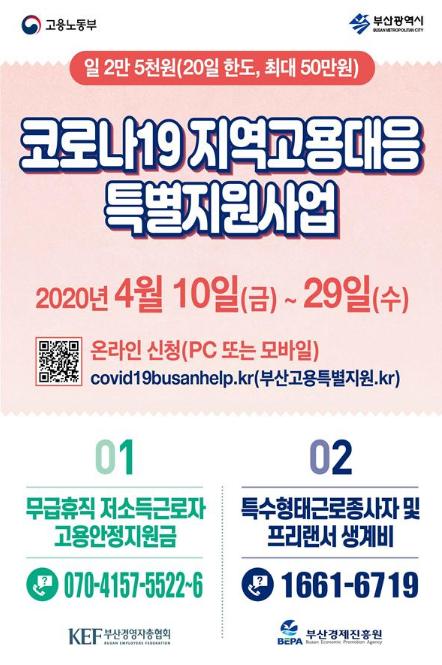이 사업은 부산시와 고용노동부가 공동으로 추진하는 「코로나19 지역고용대응 특별지원」사업으로 ▲코로나19 피해사업장 무급휴직 저소득근로자 고용안정 지원사업과 ▲특수형태근로종사자 및 프리랜서 생계비 지원사업 2가지 사업으로 구성되며, 국비 110억 원을 확보하여 23,000여 명을 지원한다.