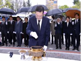 이용섭 광주광역시장은 19일 제60주년 4·19혁명 기념일을 맞아 김정순 4·19혁명희생자유족회 광주전라지부장 등 4·19단체 대표들과 함께 광주공원 4·19 추모비에 참배하고 부정과 불의에 맞서 꽃다운 젊음을 바치신 민주영령들의 고귀한 희생을 추모하고 명복을 빌었다.