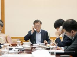 문 대통령은 최근 이틀간 코로나19 확진자 숫자가 10명대로 떨어지는 등 상황이 호전됐지만 사회적 거리두기를 완화할지 여부는 아직 고심 중이라고 설명하면서, 미국내 코로나19 증가세가 트럼프 대통령의 강력한 리더십 하에 가까운 시일내 진정되어 트럼프 대통령이 큰 관심을 두고 있는 경제 재건에 집중할 수 있는 상황이 빨리 오기를 바란다고 했다.