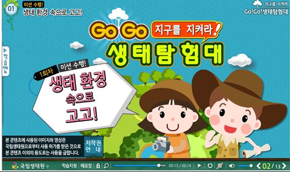이러닝교육은 생태에 대한 이해도를 높이고 생태문화 확산을 위해 초등교과 과정과 연계한 '지구를 지켜라! 고고 생태탐험대' 등 12편을 제공한다.