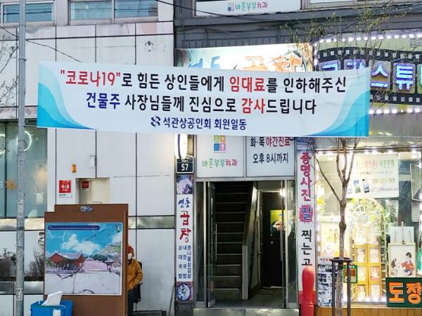 소상공인과 자영업자들은 현수막으로 화답했다. 석관상공인회 등이 임대료를 면제하거나 인하한 착한 건물주(임대인)에게 감사의 마음을 전하는 현수막을 올렸다. 성북구 곳곳에서 착한 임대인의 결단에 감사를 표하는 소상공인과 자영업자의 현수막이 펄럭이고 있다.