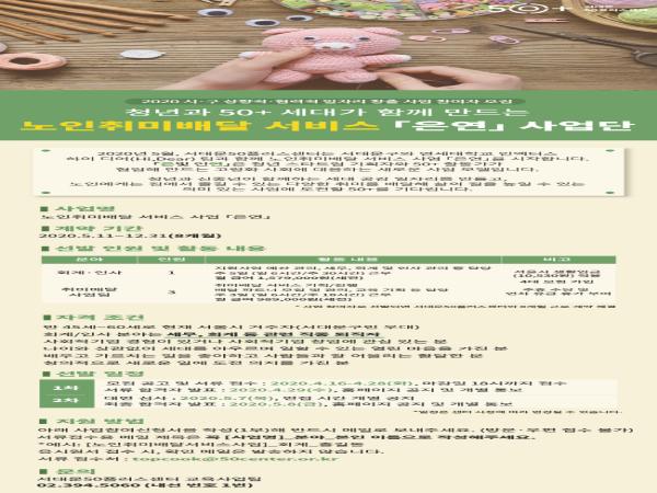 서대문구(구청장 문석진)와 서대문50플러스센터(센터장 이수빈)가 2020년 시-구 상향적·협력적 일자리 창출 사업으로 노인을 위한 취미배달서비스‘은연(은빛 인연)’을 시작한다. 은연은 청년과 50플러스 세대가 파트너가 되어 노인을 위한 다양한 취미 키트를 개발하고, 향후 완성된 키트를 통해 어르신 대상 취미배달 강사로 활동하는 신중년을 고용하는 새로운 일자리 사업 모델이다. 2020년 시·구 상향적·협력적 일자리 창출 사업은 서울시와 서대문구로부터 예산 지원을 받은 서대문50플러스센터가 지역의 청년 스타트업 동아리 연세대학교 인액터스‘하이 디어(대표 김민재)’ 팀과 함께 사업을 운영한다.