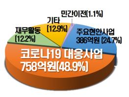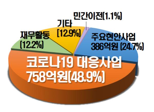 이번 추경예산안은 방역, 재난긴급생활비 및 소상공인 지원 등 코로나19 관련예산 규모가 일반회계 1,550억 원 중 758억 원(48.9%)을 차지하는 코로나19에 대응하는 ‘선택적 추경’이다.
