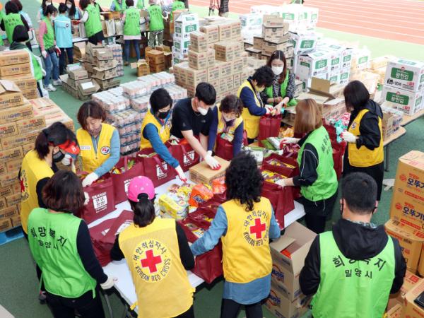 한편, 코로나19 성금으로 제작된「안녕, 밀양!」식료품 꾸러미는 앞서 4월 16일, 17일 양일간 밀양종합운동장에서 밀양시지역사회보장협의체 회원 80명이 포장작업을 했다.