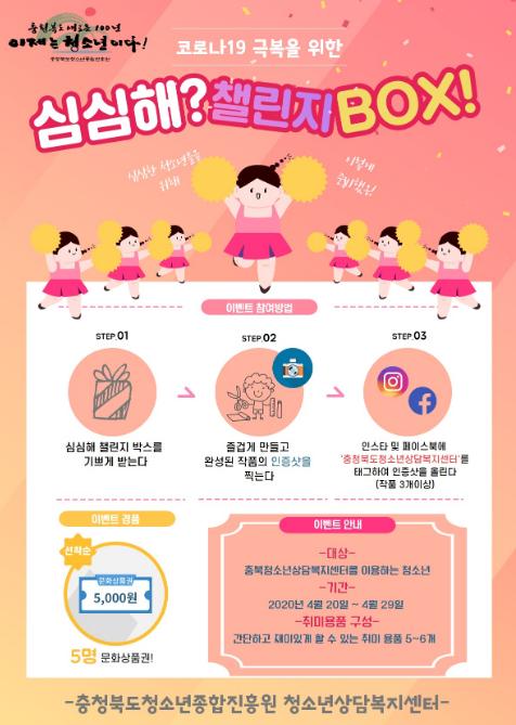 충청북도청소년종합진흥원(원장 김동환)은 코로나19의 장기화로 심리 및 정서적 불편함을 느끼는 청소년들에게 대안활동으로 할 수 있는 심심해 챌린지 박스 이벤트를 진행한다.
