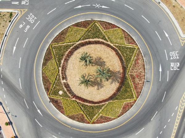 교통섬 중심에 삼여통합을 상징하는 3그루의 코크스야자 나무를 심고, 주변에는 홍가시, 가장자리는 5대양 6대주를 상징하는 5조각의 황금사철과 6조각의 꽃치자 나무를 채워 식재했다.