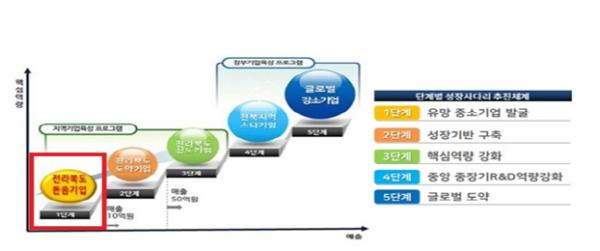한편, 전라북도 성장사다리 육성체계 지원사업은 기업규모 및 성장단계에 기초한 성장단계별 맞춤형 지원으로 지역과 중앙정부 기업지원사업을 유기적으로 연계하여 전북형 히든챔피언으로 육성을 통해 지역경제의 버팀목이 될 수 있도록 지원하는 사업이다.