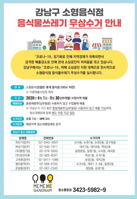 ‘기분 좋은 변화, 품격 있는 강남’을 구현 중인 강남구(구청장 정순균)가 코로나19 장기화로 경영난을 겪고 있는 소상공인을 돕기 위해 1일부터 관내 소형음식점 1만여개소의 음식물쓰레기를 무상으로 수거하고 있다.
