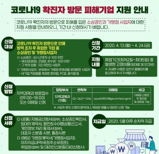 금천구(구청장 유성훈)는 코로나19 확진자 방문으로 피해를 보고 있는 소상공인과 가맹점사업자를 대상으로 임대료 및 인건비 등 고정비용을 지원하고 있다고 밝혔다.