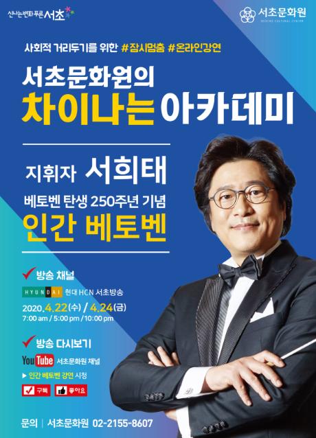이번 강연은 2009년 MBC 드라마‘베토벤 바이러스’의 주인공 강마에의 실제 모델이자 예술 감독인 서희태 지휘자가 베토벤 탄생 250주년 기념하여 <인간 베토벤>의 삶과 음악이야기를 쉽고 재미있게 인문학적으로 풀어낼 예정이다.