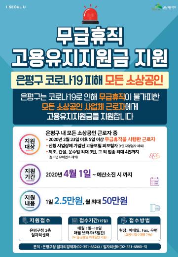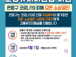 은평구는 코로나19 확산 피해로 인해 고용조정이 불가피하여 무급 휴직을 실시한 관내 소상공인 사업체의 경영안정과 근로자의 실업예방 및 생계유지를 위해 고용유지지원금 지원을 확대하였다고 밝혔다.