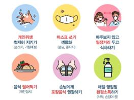 생활 속 방역 실천을 위한 음식점 식사 지침은 △개인접시 사용 △이용자 사이 또는 이용자와 종사자간 거리유지 △마스크 쓰기 △종사자 건강관리 △영업장 수시 소독하기 등이 요구된다.