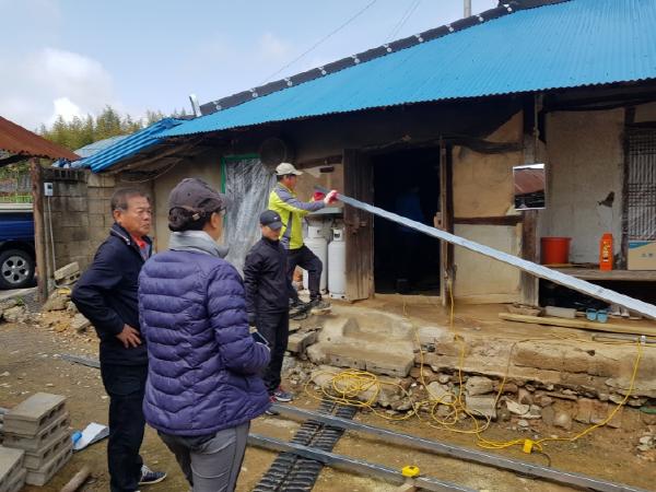 성내면 부덕마을에 사는 어르신은 흙집에 거주하시는데 너무 낡고 오래된 집이라 기둥(지지대)이 없으면 무너질 정도로 위험하고, 벽이 허물어져 외부와도 노출이 심하여 단열도 되지 않는 상황이었다.