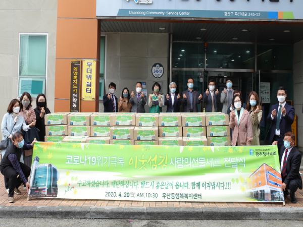 20일 광주청사교회(목사 백윤영)가 광산구 우산동 행정복지센터에 코로나19로 어려움을 겪고 있는 취약계층을 위해 써달라며 1,000만원 상당의 간편식·과일 등이 들어있는 선물꾸러미를 맡겼다.