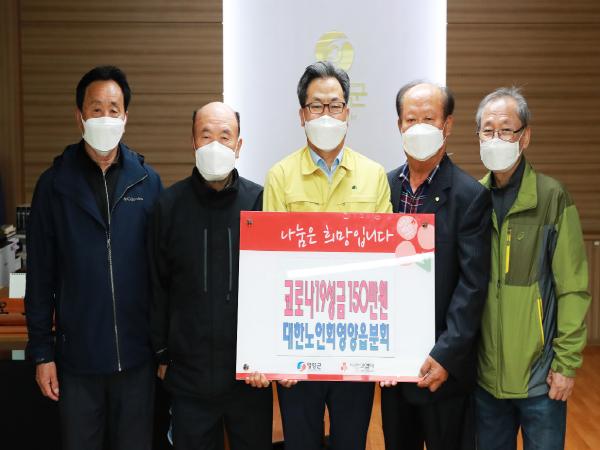 대한노인회 영양읍분회(회장 권순종), 입암면분회(회장 김봉기), 일월면분회(회장 장수영), 수비면분회(회장 권병희), 석보면분회(회장 황정곤)는 지난 3월 31일 영양군청을 방문하여 550만원의 성금을 기탁하며 코로나19 극복에 동참하였다.
