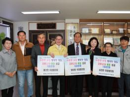 지난 20일 용산면이장협의회(협의회장 조규군), 양산면이장협의회(협의회장 임구호), 심천면이장협의회(협의회장 배정애)가 영동군청을 찾아 소속 이장들의 정성으로 십시일반 모은 성금 각100만원씩을 ‘레인보우 행복나눔’에 기탁했다.