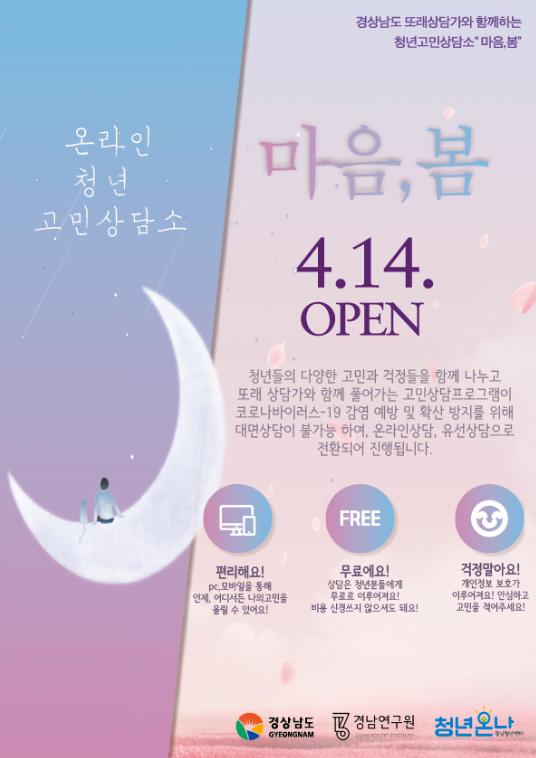 청년 고민상담은 경상남도 청년센터(청년온나) 홈페이지(http://www.youthonna. com) ‘청춘와락’ 게시판을 통해 신청 가능하다.