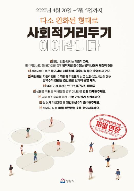 성남시는 정부방침에 따라 5월 5일까지 사회적 거리두기를 연장한다고 21일 밝혔다.