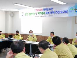 울진군(군수 전찬걸)은 코로나19 여파로 어려움에 처한 지역경제를 되살리기 위해 3월 31일 「코로나19」 피해극복을 위한 군민생활 안정 및 지역경제 회복 대책 추진 보고회를 개최했다.