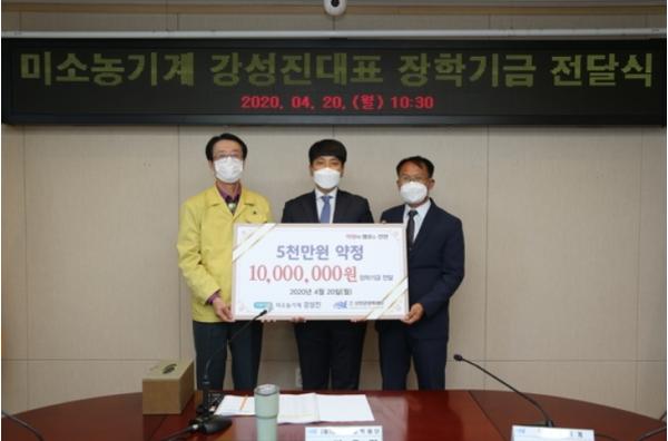 미소농기계 강성진 대표는 20일 (재)신안군장학재단에 지역인재육성을 위한 장학기금 5천만원 기탁을 약정하고, 1천만원의 장학기금을 전달했다.