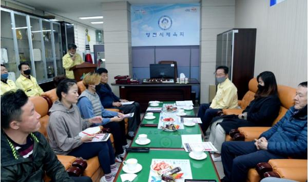영천시(시장 최기문)는 21일 코로나19로 인한 민생안정?경제지원책에 따른 여론을 수렴하고 각계각층 현실의 어려움 파악 및 지원대책을 마련하기 위해 영천시 체육회 사무실에서 체육시설 운영 관계자 10여명이 참석한 가운데 간담회를 가졌다.