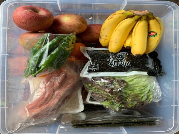 신선식품 꾸러미 키트는 재래시장에서 직접 구매한 고기와 채소, 과일, 떡 등을 넣어 만들었다.