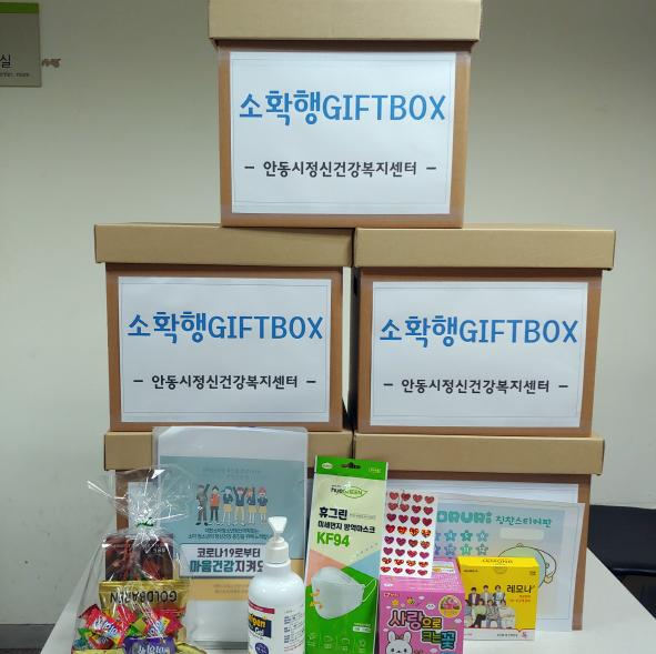 이 사업은‘집콕생활에서 찾는 소확행’이라는 슬로건 아래 안동시정신건강복지센터에 등록되어 사례관리 중인 아동·청소년들에게‘소확행 GIFT BOX’를 배부함으로써 이들에게 심리적 안정과 행복감 향상을 도모한다.
