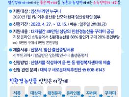 지원대상은 대덕구 관내 거주자 중 2020년 1월 1일 이후 출산한 산모와 현재 임신상태인 임부다. 신청기간은 오는 27일부터 12월 15일까지이며 지원내용은 12개월간 48만원 상당의 친환경농산물 꾸러미를 가정에 제공하는 것으로, 지정된 온라인 쇼핑몰을 통해 친환경농산물을 80% 할인된 가격으로 구매할 수 있고 산모는 결제금액의 20%만 자부담하면 된다.