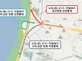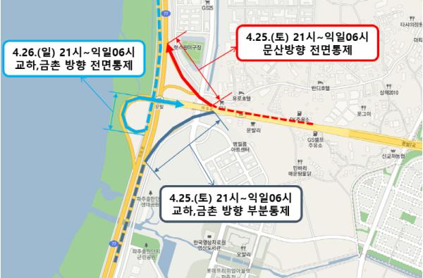 문발IC 포장공사에 따라 4월 24일 21시부터 다음날 오전 6시까지 자유로(문산방향)~56호선 금촌, 교하 방향 1개 차선을 부분 통제하며 4월 25일 토요일 21시부터 다음날 오전 6시까지 56호선(문발IC 방향)~자유로 문산 방향을 전면 통제한다. 또한 4월 26일 일요일 21시부터 다음날 오전 6시까지 자유로(서울방향)~금촌, 교하 방향을 전면통제 한다.