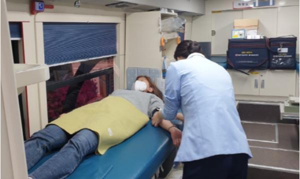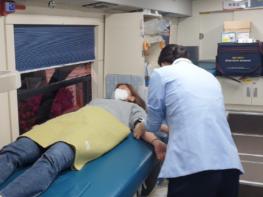 코로나19로 인해 혈액수급에 비상이 걸린 가운데, 군포시청 공무원들이 4월 22일 시청 분수대 앞 헌혈버스 안에서 헌혈하고 있다.