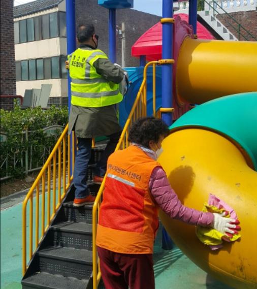 평택시 신장2동 자원봉사나눔센터(센터장 윤정임)와 청소년지도위원회(위원장 양지원)는 지난 21일 코로나19 확산 방지와 아이들의 안전을 위해 놀이터 놀이기구 및 벤치 등 방역소독과 사회적 거리두기 홍보물을 나눠주는 캠페인을 실시했다.