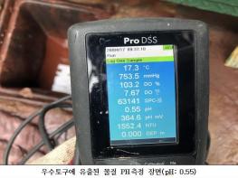 시는 4월 17일 오전 8시경 옥구천(옥구6교)에 붉은색 폐수가 나온다는 민원을 접수했다. 비상연락을 통해 즉시 현장에 출동해 확인한 결과, 원인불명의 붉은물이 우수토구에서 흘러나오고 있는 사실을 확인하고 우수맨홀을 확인하며 약 150m를 역추적한 결과 D업체에서 유출되고 있는 사실을 적발했다.