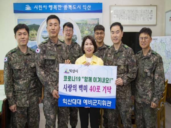 익산대대 예비군지휘관(익산대대장 최민호)은 지난 22일 익산시청을 방문하여 코로나19 로 인해 생활이 어려운 이웃들을 위해 백미 40포(10kg)를 기탁했다.