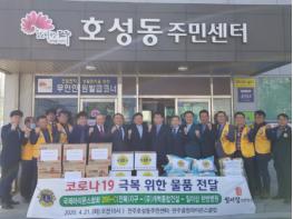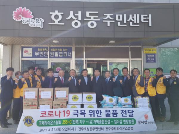 전주시 국제라이온스협회356-C(전북)지구(총재 김영천)와 123한방병원(원장 김일), 123헬스클럽(대표 이영섭)은 21일 호성동주민센터(동장 허광회)를 방문해 코로나19 극복을 위한 이웃돕기 물품 전달식을 가졌다.