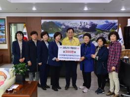 봉화군(군수 엄태항)은 4월 20일 (사)생활개선회 봉화군연합회(회장 김옥랑), (사)여성농업인 봉화군연합회(회장 우해월)에서 봉화군청을 방문하여 코로나19 극복을 위한 특별성금 300만원을 기탁했다고 밝혔다.