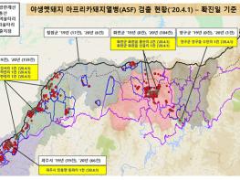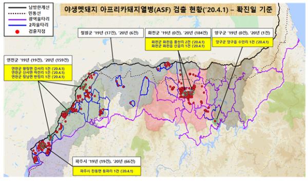 국립환경과학원은 4월 1일 멧돼지 8개체에서 아프리카돼지열병 바이러스를 확진하고 결과를 관계기관에 통보했다. 이로써 화천군 187건, 연천군 181건, 파주시 86건, 철원군 23건, 양구군 2건, 총 479건의 멧돼지 아프리카돼지열병이 확진됐다.