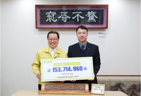 이날 전달식에는 조광한 남양주시장과 소병연 NH농협은행 남양주시 지부장 등의 관계자들이 참석한 가운데, 소병연 지부장이 시와 NH농협은행 간 제휴카드 협약에 따라 조성된 기금 총 1억5천3백71만4천960원을 시에 전달했다.